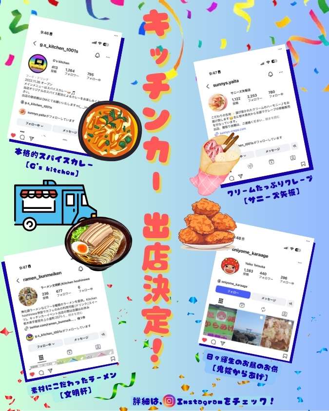 当日は、楽しい企画の他に、キッチンカーも来ますので、是非お越し下さい!