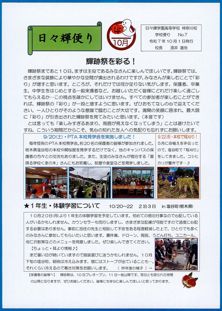 2025年10月02日 入学希望者向け 日々輝便り・10月号を発行しました(神奈川校) 10/2更新・毎月、発行している学校便り『日々輝便り』。10月号を発行しましたので、こちらのHPにも掲載しておきます。まだ読んでいなかった、届いていなかったという保護者の皆様、ぜひお読みください。 ★生徒のみなさんへ★ 本日(10月2日)は、午前授業です。9時15分までに登校してください。なお、午後は輝跡祭準備となります。