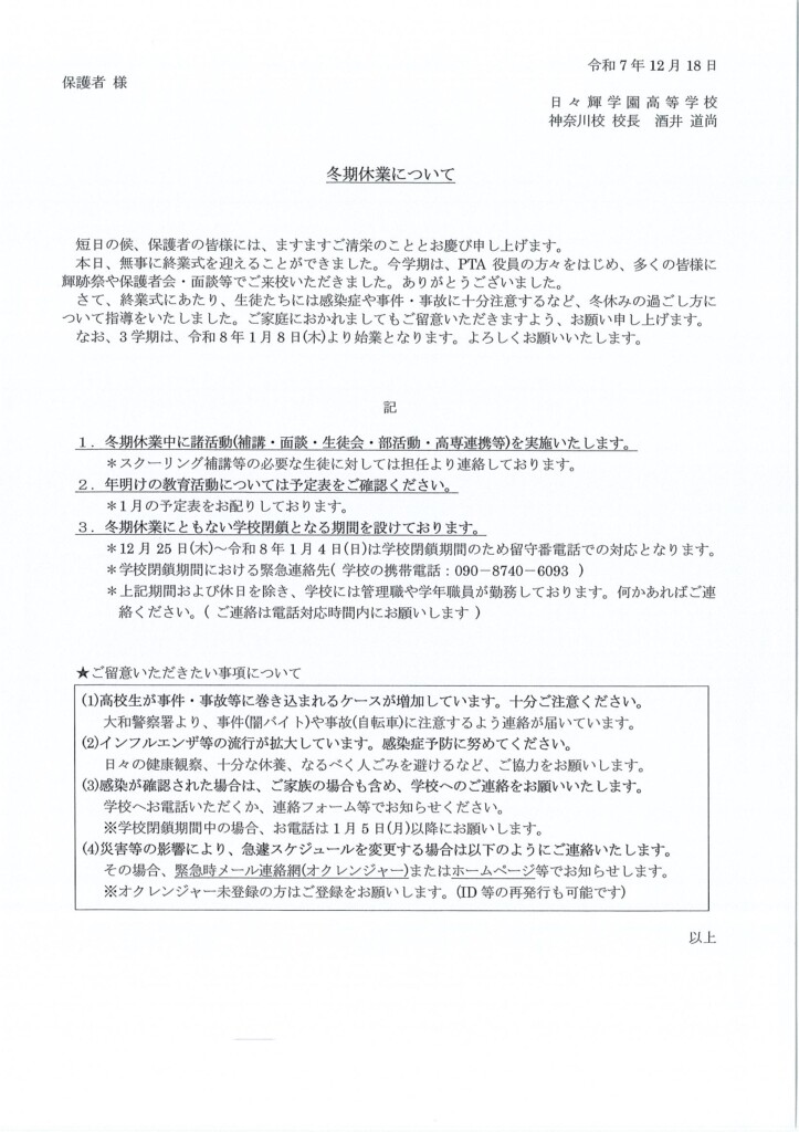 現在、冬休み期間(12月19日〜1月7日)です。事故などに気をつけて過ごしてください。