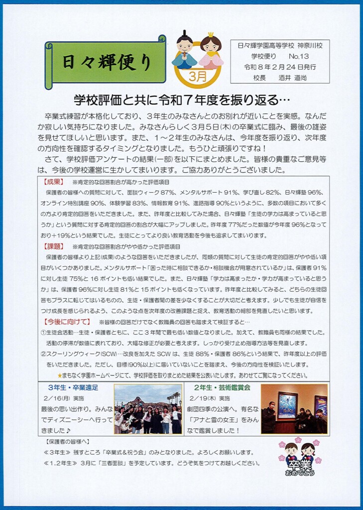 2026年02月27日 入学希望者向け 日々輝便り・3月号を発行しました(神奈川校) 2/27更新・日々輝便り3月号!毎月、発行している学校便り『日々輝便り』。3月号を発行しましたので、こちらのHPにも掲載しておきます。まだ読んでいなかった、届いていなかったという保護者の皆様、ぜひお読みください。 ★生徒のみなさんへ★ 本日(2月27日)は、短縮授業です。9時15分までに登校してください。なお、3年生は登校日となります。
