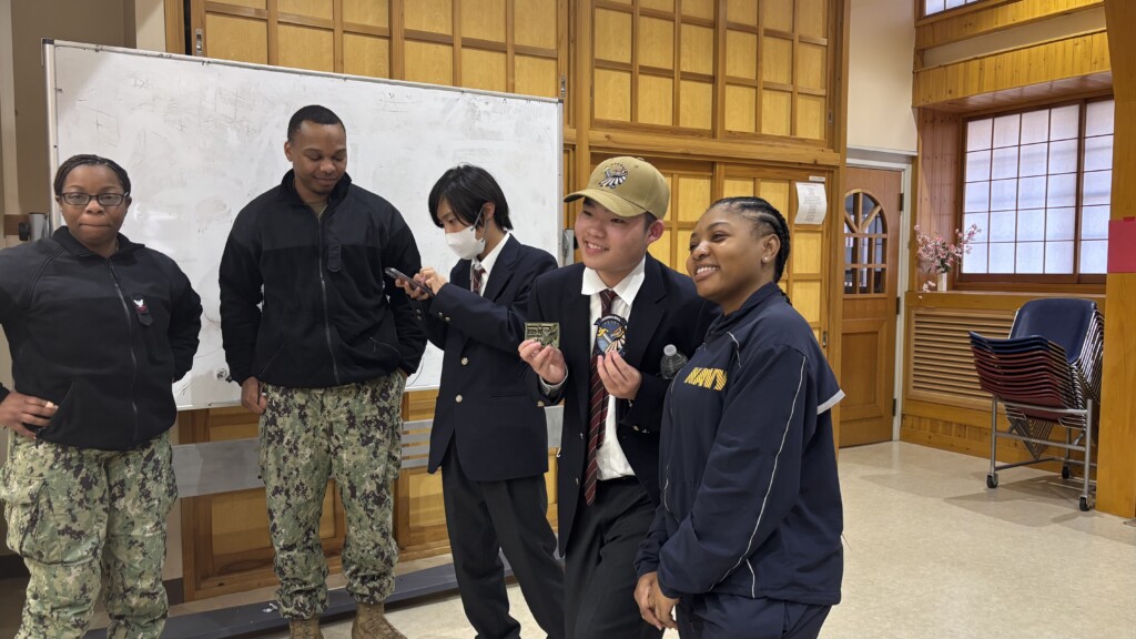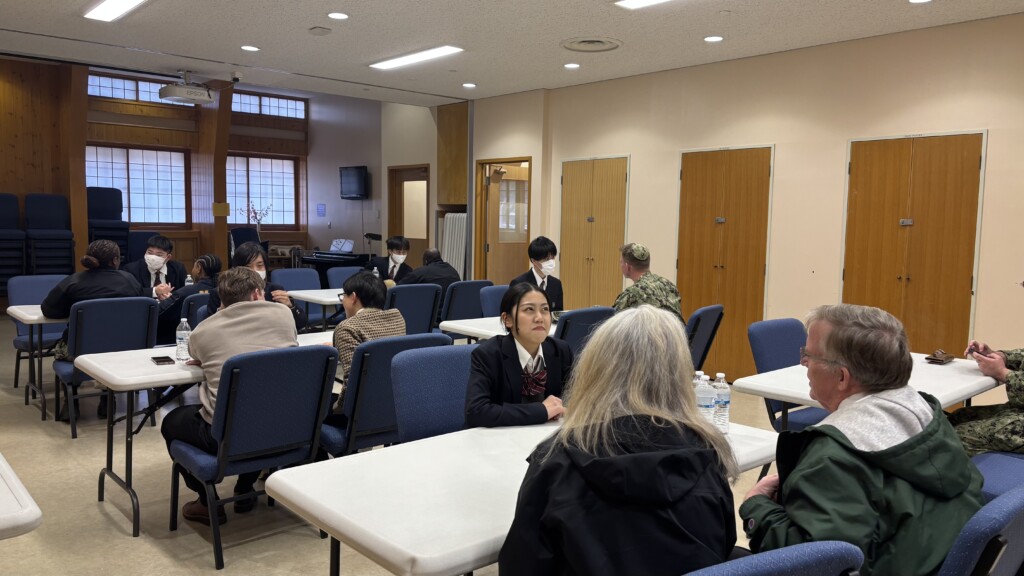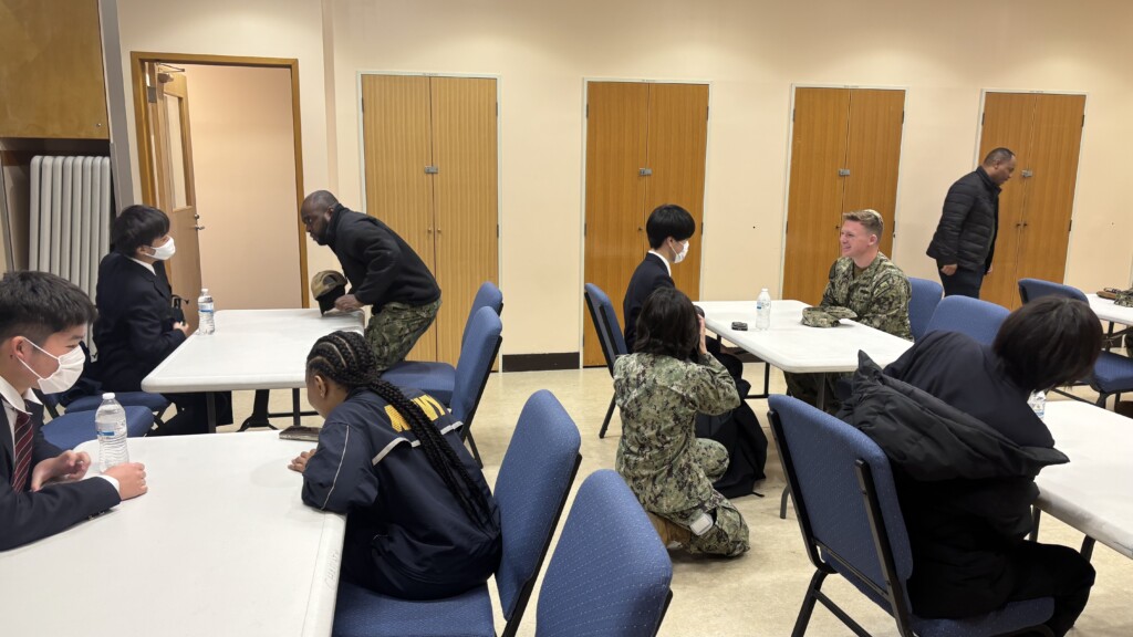 まず基地の施設などを見学させてもらいました。さらに、米軍の皆様と英会話を楽しむ場面が用意されていました。とても貴重な機会をいただき、参加した生徒たちは楽しかったと語っていました。なかには軍の帽子をプレゼントしてもらった生徒もいたようです。