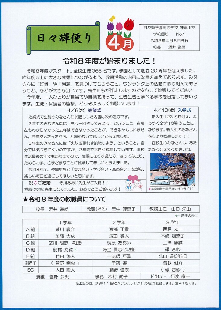 2026年04月14日 入学希望者向け 日々輝便り・4月号を発行しました(神奈川校) 4/14更新・日々輝便りを発行しました!毎月、発行している学校便り『日々輝便り』。令和8年度のスタートとともに4月号を発行しましたので、こちらのHPにも掲載しておきます。まだ読んでいなかった、届いていなかったという保護者の皆様、ぜひお読みください。 ★生徒のみなさんへ★ 本日(4月14日)、オリエンテーション(健康診断)です。9時15分までに登校してください。なお、ジャージなどの持ち物を忘れないようにお願いします。
