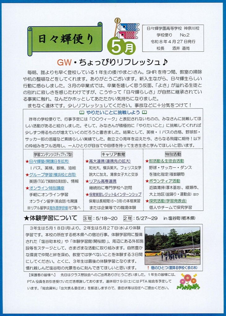 2026年04月28日 入学希望者向け 日々輝便り・5月号を発行しました(神奈川校) 4/28更新・日々輝便りを発行しました!毎月、発行している学校便り『日々輝便り』。5月号を発行しましたので、こちらのHPにも掲載しておきます。まだ読んでいなかった、届いていなかったという保護者の皆様、ぜひお読みください。 ★生徒のみなさんへ★ 本日(4月28日)、平常授業です。9時15分までに登校してください。なお、面談ウィークのため授業は4限までとなります。
