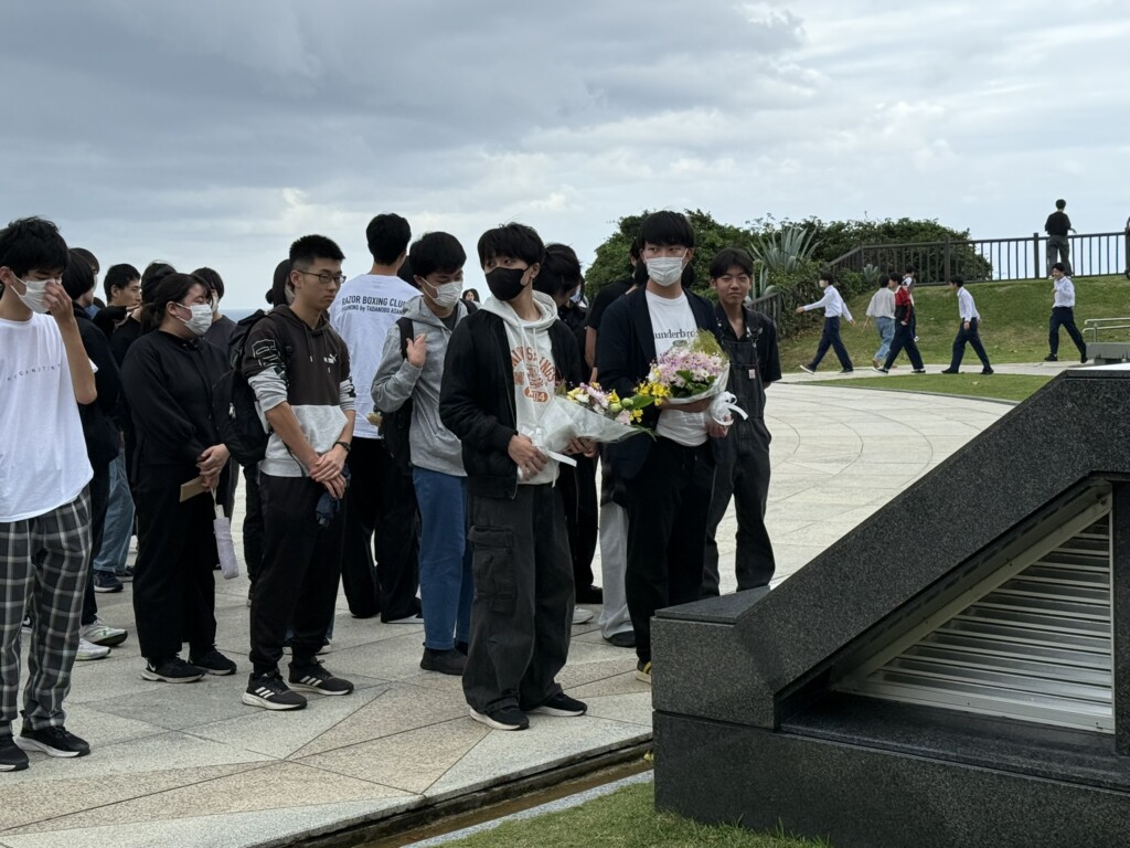 沖縄到着後は、まず平和祈念公園とひめゆりの塔を訪れました。代表生徒による献花の後、全員で黙祷を捧げ、平和について思いを巡らせました。途中、通り雨に見舞われたため長時間の滞在はできませんでしたが、ひめゆり平和祈念資料館でのビデオ視聴や展示を通して、生徒たちは多くのことを感じ取っていた様子でした。