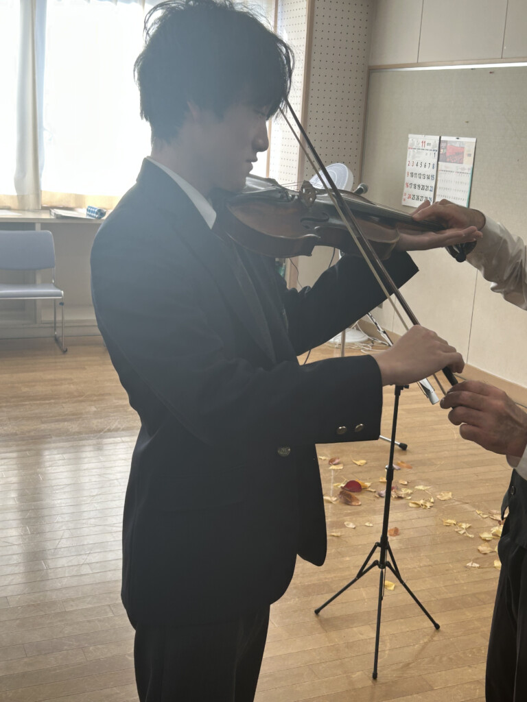 演奏会の後はストラディバリウスを実際に触ったり、演奏させてもらえたりと貴重な機会を頂きました。生徒たちはみんな興味津々で、積極的に参加させていただきました。