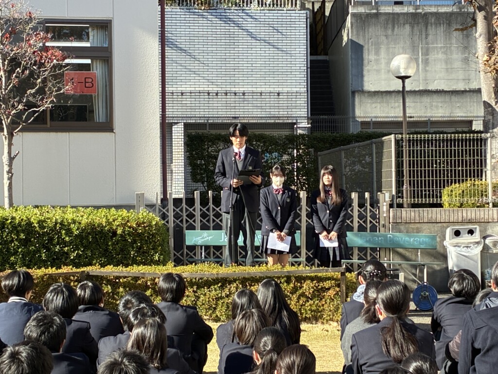 2025年12月04日 入学希望者向け 生徒会選挙がおこなわれました 12月4日、新生徒会を決める生徒会選挙がおこなわれました。 候補者たちの選挙ポスターが事務室前に掲示され、当日は候補者全員と推薦者の演説が中庭でおこなわれました。 それぞれが語る今後の学校生活に対する決意表明を全校生徒全員が真剣に聞いていました。