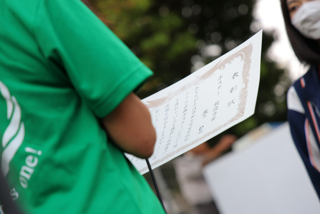 茶畑祭最後は閉会式が中庭で行われました。準備期間から、当日の運営まで生徒たちが本当によく頑張ったと思います。閉会式では最優秀賞や部門賞、校長賞、ポスター賞の発表もありました。