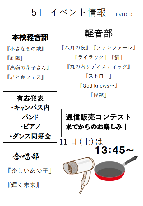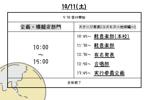 2025年10月09日 入学希望者向け 翔輝祭10/11(土)ステージ発表のお知らせ 明後日の翔輝祭10/11(土)のステージ発表@5階ホールのお知らせです。 【公開時間】10:00~15:00【当日のステージ部門(5階)タイムスケジュール】10:45〜11:15 本校軽音楽部11:30~12:15 宇都宮軽音楽部発表12:30~12:50 有志発表12:50〜13:00 合唱部発表13:45~14:30 実行委員会・生徒会企画 何かご質問などあれば、028-614-3866まで、ご連絡ください。