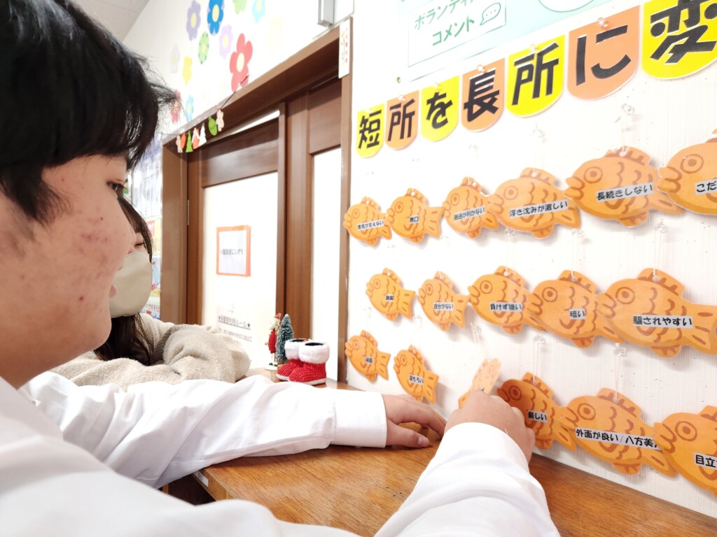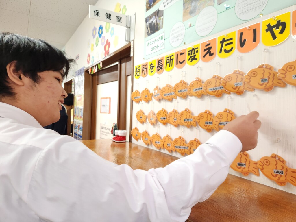 保健室前には「短所を長所に変えたいやき屋」という掲示がされています。これは、否定的(ネガティブ)にとらえている物事を別の視点から見ることで肯定的(ポジティブ)に変えるリフレーミングを紹介したものです。進路活動が真っ盛りの3年生に向けて、養護の先生が作成してくれました。もちろん、3年生だけでなく、全学年の生徒のみなさんに向けて発信しています。1階保健室前に掲示してありますので、ぜひ足を止めてみてくださいね。保護者の方や中学生のみなさんも、横浜校にお越しの際は、ぜひご覧ください。