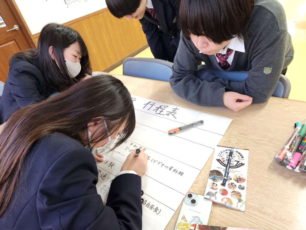 出発に先立って、先週の金曜日は朝から大きい荷物のトラックへの搬入が行われました。大きい荷物は先に沖縄に旅立ちホテルでみなさんの到着を待っています。そして、事前学習が行われ学年集会で先生方からの旅行中の注意事項行程の確認や、旅行中に訪れる観光地の予習などを行っていました。実行委員も掲示用の行程表を作成するなど事前準備を念入りにしていました。