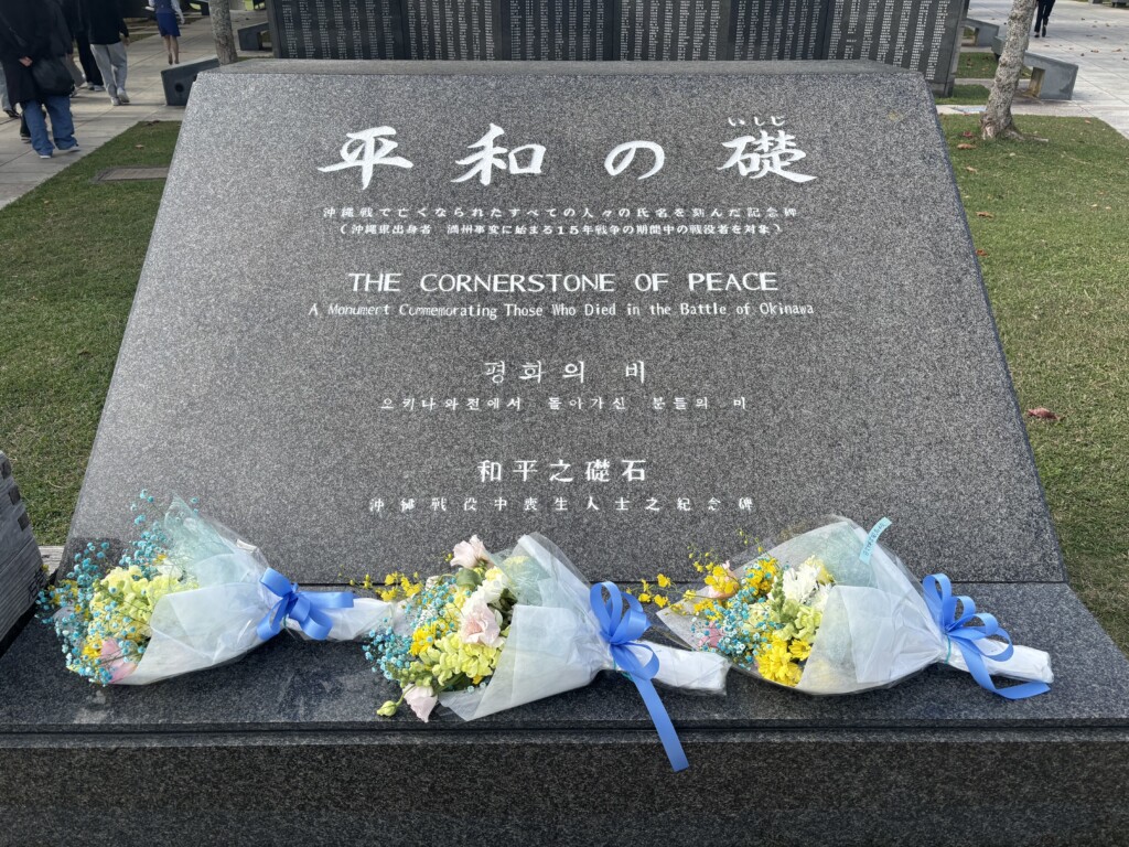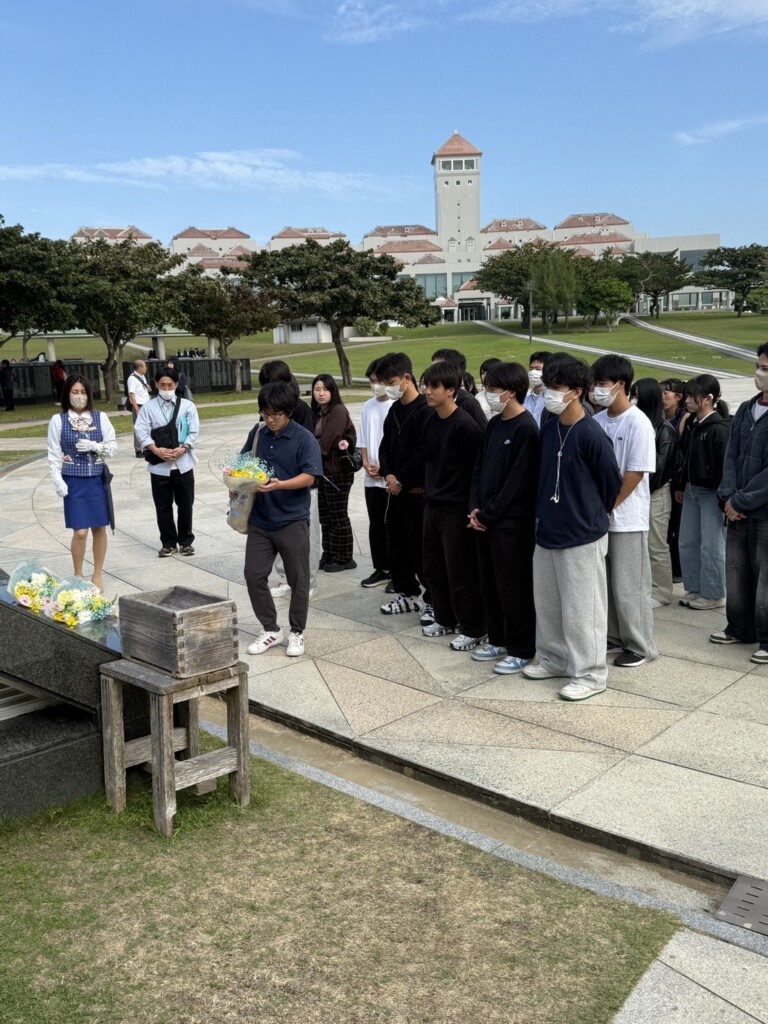午前中は、平和祈念公園とひめゆり資料館を訪れました。ガイドさんの案内で、沖縄戦の悲惨さなどを再認識し、沖縄戦で亡くなられたすべての方々への追悼の意を表し、献花、黙とうを行い今日の平和の尊さを再確認し祈念しました。
