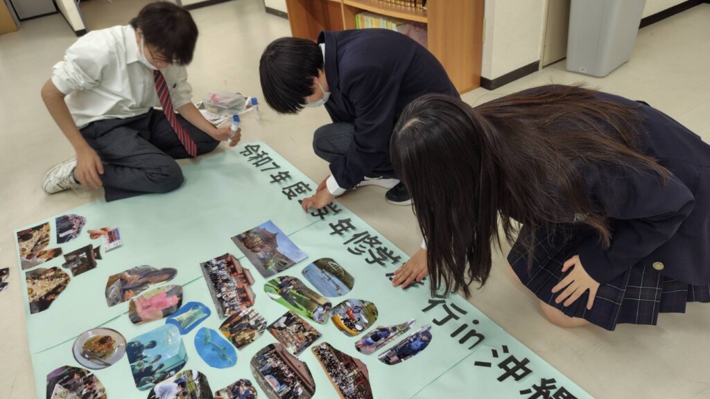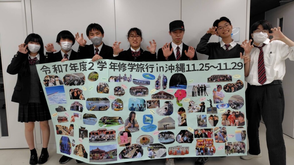 2025年12月12日 入学希望者向け 2年生 修学旅行の掲示物を作成しました(横浜校) 2年生の修学旅行実行委員が11月に実施された沖縄修学旅行の様子を報告する掲示物を作成しました。5日間の様子がわかる写真を選び、レイアウトを考えるなど和気あいあいとした雰囲気の中、協力しながら完成させることができました! 完成した掲示物は校舎の廊下にありますので、横浜校にお越しの際は、ぜひ足を止めてご覧ください。