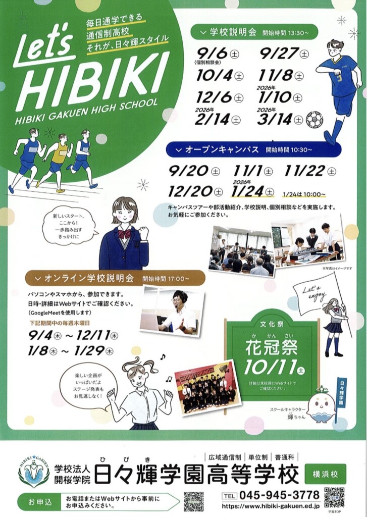 2026年01月24日 入学希望者向け 【中学生対象】学校説明会のご案内(横浜校) 令和7年度の学校説明会を以下の日程で開催いたします。 横浜校のことをより知っていただくためのイベントとなっています。ぜひ、ご参加ください!! 説明会・オンライン説明会は【予約制】となっていますので、ホームページまたはお電話からお申込みください。みなさまのご参加をお待ちしています。 以下のリンクからお申込みできます。https://www.hibiki-gakuen.ed.jp/ss-oc/