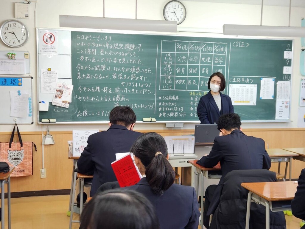 2026年02月10日 入学希望者向け 1.2年生 単位認定試験を頑張っています(横浜校) 1、2年生は、2月9日(月)から13日(金)まで単位認定試験となっています。(11日(水)は祝日のためお休み)今年度最後の定期試験ということもあり、いつもに増して対策プリントやトライアルウィークでしっかりと勉強をしていたとの声を多く聞きました。 今日は2日目ですが、進級に関わる大切な試験にもなりますので、最後までしっかりと自分の持っている力を出し切れるよう全力で試験に臨んでほしいと思います。がんばれ、1.2年生!!