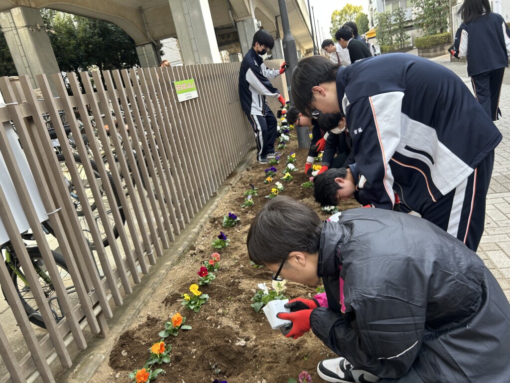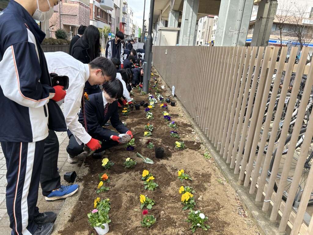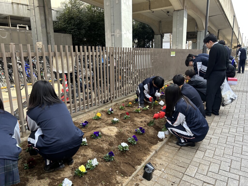 この日は、LHRの時間を使って全クラスの1年生が植え替え作業に参加しました。いつもお世話になっているお花屋さんにご指導いただき、約700株の花を手際よく植えることができ、あっという間に花壇がきれいに生まれ変わりました。作業中には、通りがかった近隣の方から「いつも綺麗にしてくれてありがとう。」「きれいな花壇が楽しみだわ」などと声をかけていただき、励みとなりました。