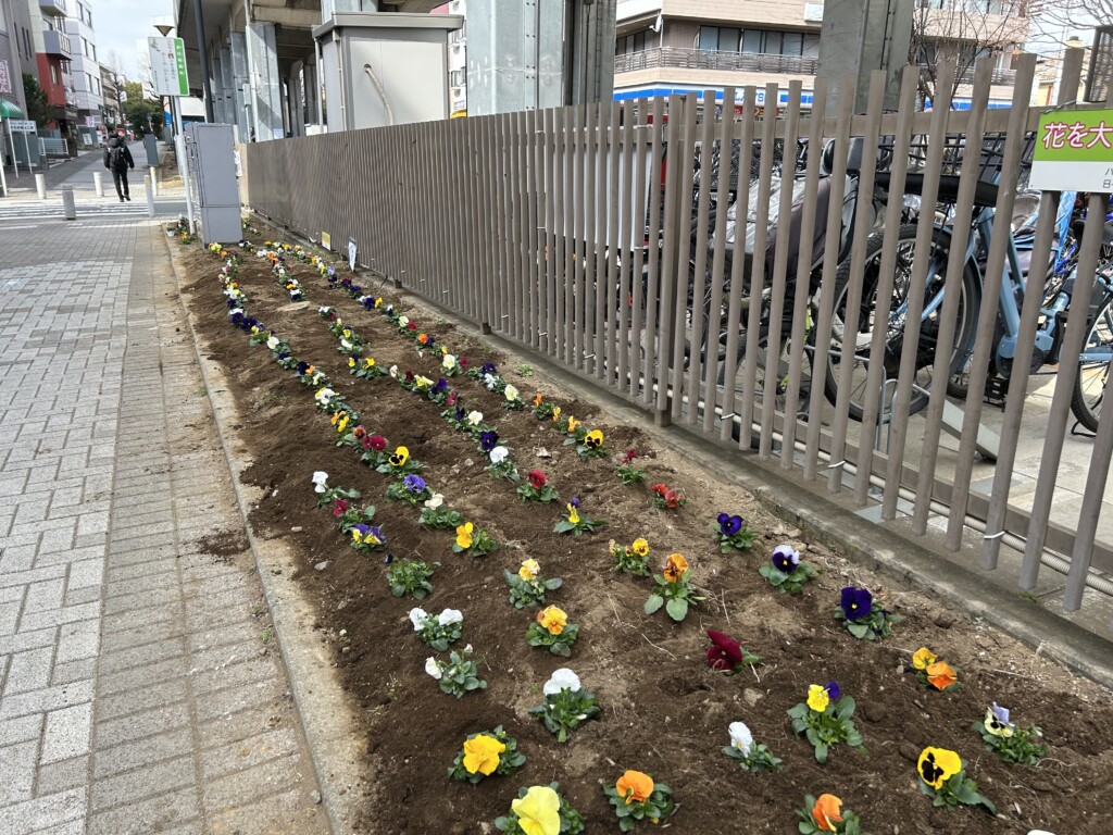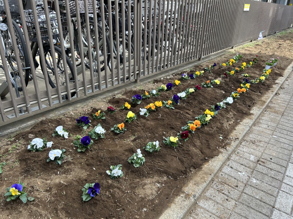 現在、横浜校前にはパンジー、ビオラ、デイジー、ノースボールがきれいに咲いています。