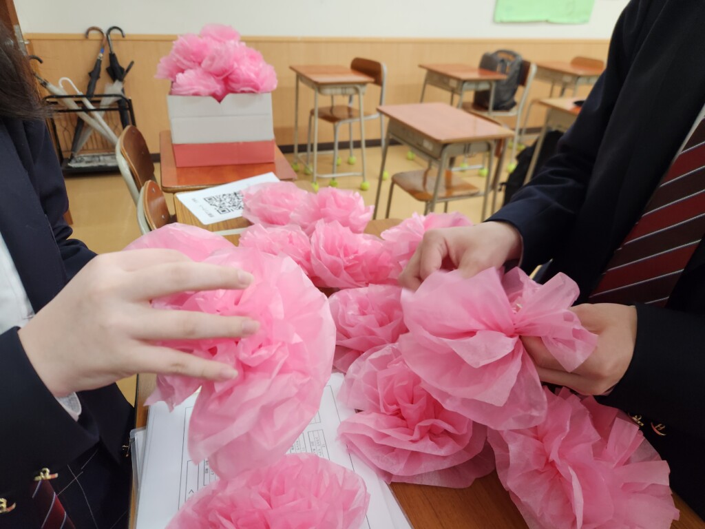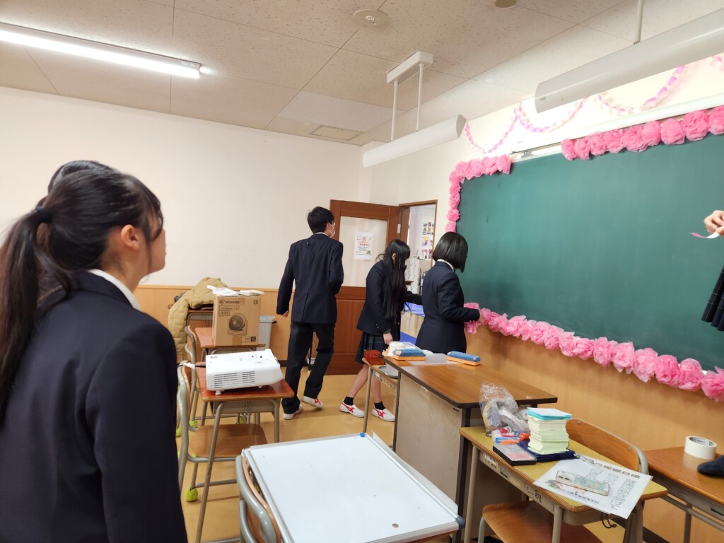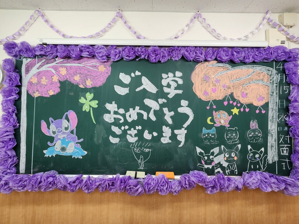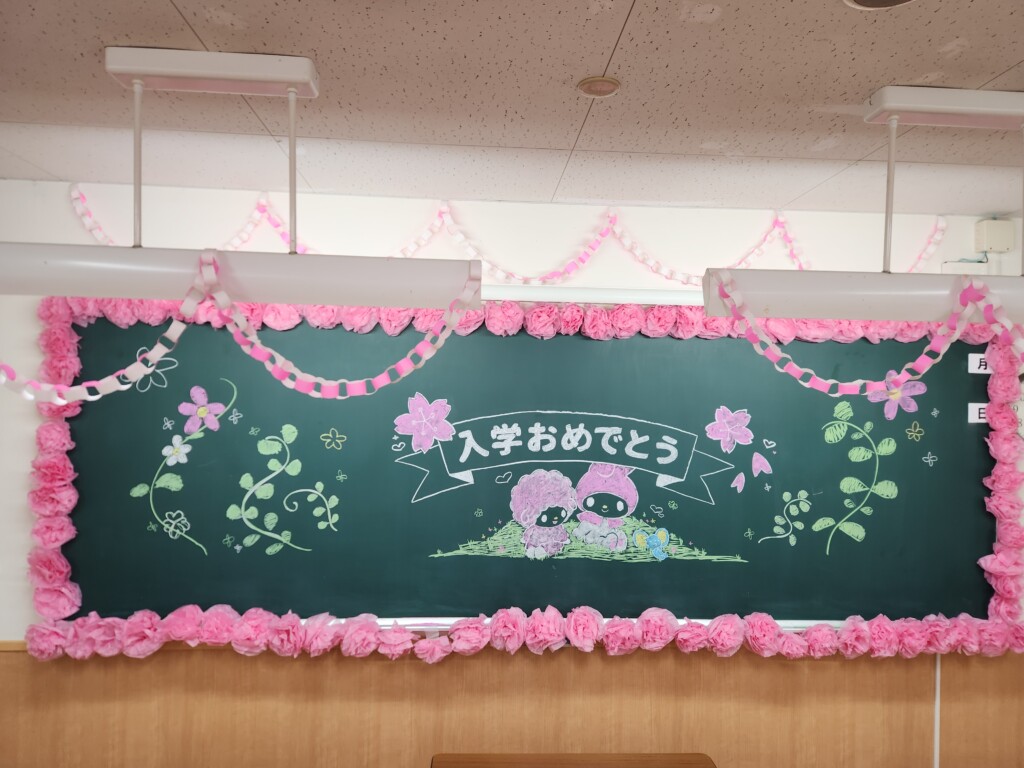 明日、4月14日(火)は入学式です。1年生はその翌日から校舎に登校します。登校日の初日に合わせて2、3年生が教室を飾り付けました。先輩たちの1年生の入学を祝う思いが込められています。お花や輪飾り、黒板アートなど、2、3年生が思いを込めて装飾していました。1年生のみなさんの緊張が少しは和らぐと思いますので、登校した際には黒板にも注目してみてくださいね。